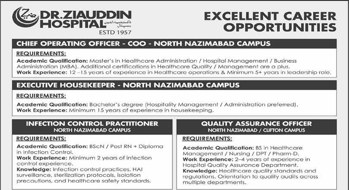 CAREER OPPORTUNITIES Ziauddin Hospital Karachi New Jobs 2026 We hope you achieve your goals and land a well-paying job. We over at https://idealjobs.pk are working hard towards your better future, and we hope you will always support our platform. VACANT POSITIONS IMPORTANT INSTRUCTIONS & HOW TO APPLY
