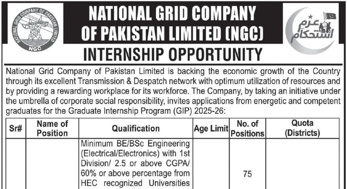 CAREER OPPORTUNITIES National Grid Company NGC Internship 2025-2026 The National Grid Company of Pakistan Limited (NGC), a vital organization backing the country’s economic growth through its extensive Transmission & Despatch network, has announced a major internship opportunity for young, energetic, and competent graduates. Under its corporate social responsibility initiative, NGC is inviting applications for its… Read More »