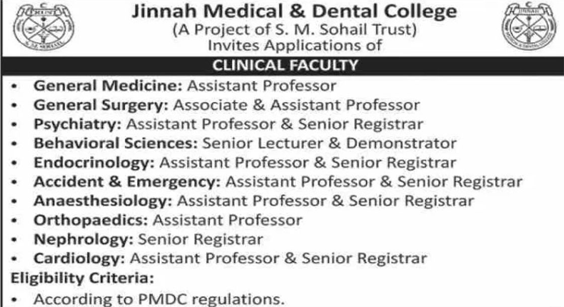 CAREER OPPORTUNITIES Jinnah Medical & Dental College JMDC New Jobs 2025 Jinnah Medical & Dental College (JMDC), a project of S. M. Sohail Trust in Karachi, is inviting applications from qualified and experienced medical professionals for faculty positions in both its Clinical and Basic Sciences Departments. The eligibility criteria for all positions are strictly in accordance… Read More »