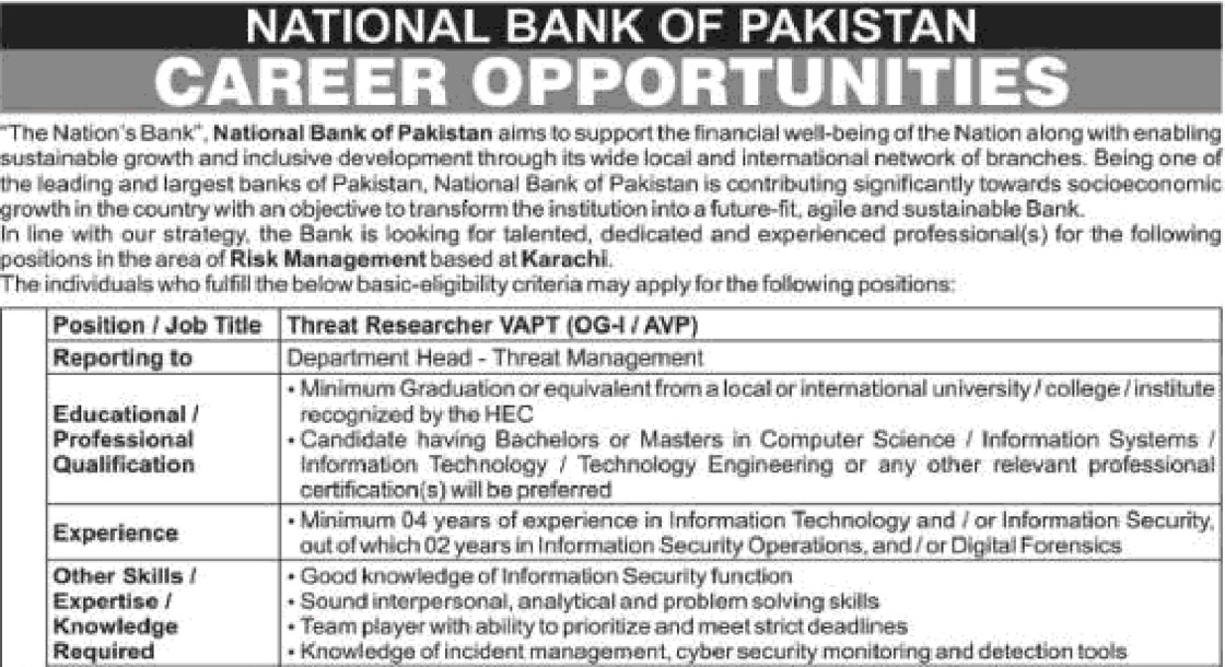 National Bank of Pakistan Jobs December 2025 Apply Online By idealjobs99 | December 24, 2025 0 Comment CAREER OPPORTUNITIES National Bank of Pakistan Jobs December 2025 Apply Online VACANT POSITIONS IMPORTANT INSTRUCTIONS & HOW TO APPLY