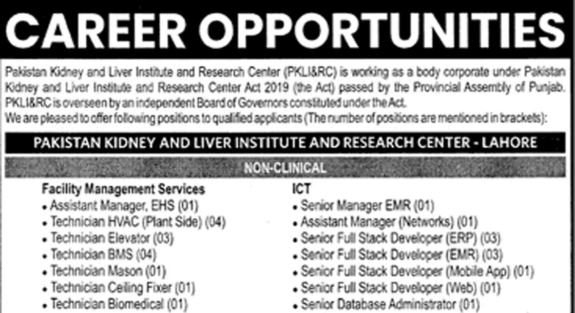 CAREER OPPORTUNITIES Pakistan Kidney and Liver Institute and Research Centre New Jobs 2026 PKLI ย  We hope you achieve your goals and land a well-paying job. We over atย https://idealjobs.pkย are working hard towards your better future, and we hope you will always support our platform. VACANT POSITIONS IMPORTANT INSTRUCTIONS & HOW TO APPLY