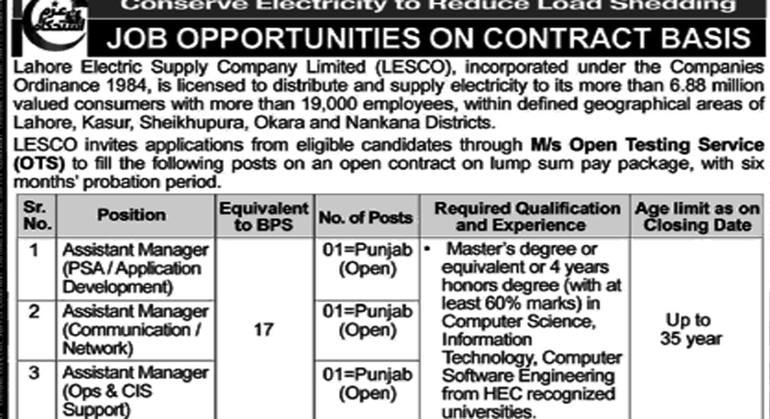 CAREER OPPORTUNITIES Lahore Electric Supply Company New Jobs 2025 LESCO We hope you achieve your goals and land a well-paying job. We over at https://idealjobs.pk are working hard towards your better future, and we hope you will always support our platform. VACANT POSITIONS IMPORTANT INSTRUCTIONS & HOW TO APPLY