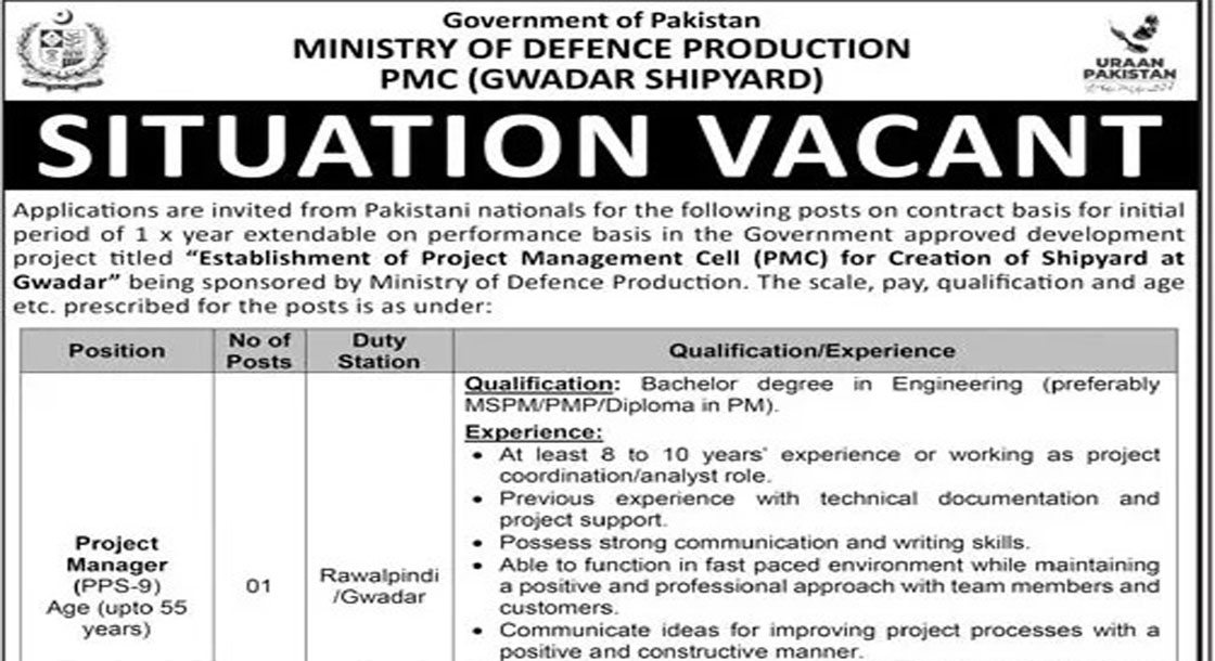 CAREER OPPORTUNITIES Ministry of Defence Production Jobs 2025 Latest The Ministry of Defence Production Jobs 2025 have been officially announced for the Project Management Cell (PMC) Gwadar Shipyard, inviting applications from highly qualified and experienced Pakistani nationals. These positions are offered on a contract basis for 1 year, extendable depending on satisfactory performance and project requirements. VACANT POSITIONS IMPORTANT… Read More »