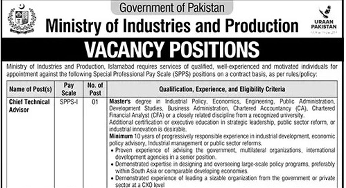 CAREER OPPORTUNITIES Ministry of Industries and Production Jobs 2026   We hope you achieve your goals and land a well-paying job. We over at https://idealjobs.pk are working hard towards your better future, and we hope you will always support our platform. VACANT POSITIONS