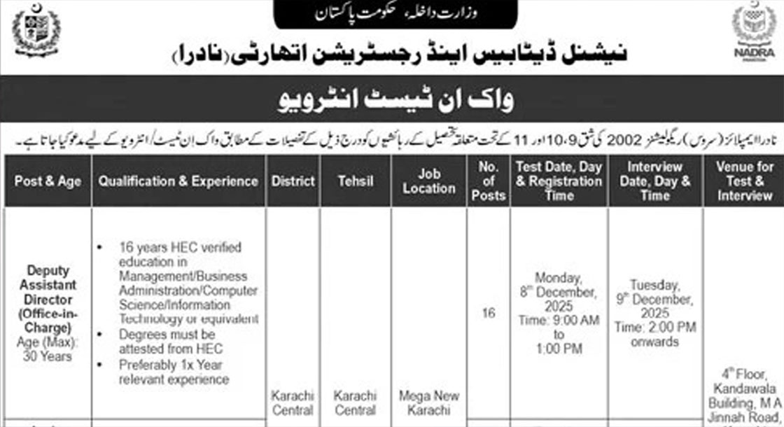 CAREER OPPORTUNITIES NADRA Intelligence Officer Jobs 2025 The National Database and Registration Authority (NADRA), under the Ministry of Interior, Government of Pakistan, has announced multiple job openings for Intelligence Officers nationwide. With positions available across all major provinces and regions—including Punjab, Sindh, Karachi, Lahore, Multan, Sukkur, Gwadar, Gilgit Baltistan, and Azad Jammu & Kashmir—this recruitment drive offers… Read More »