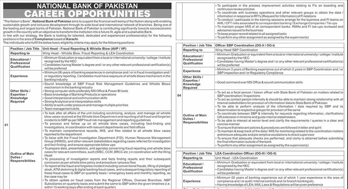 CAREER OPPORTUNITIES National Bank of Pakistan NBP New Jobs December 2025 NBP Career Opportunities 2026 – Apply Online for Banking Jobs in Pakistan The National Bank of Pakistan (NBP) has announced multiple career opportunities 2026 for experienced, qualified, and motivated banking professionals across Pakistan. As one of the leading public sector banks, NBP Jobs 2026 offer an excellent opportunity to build a… Read More »