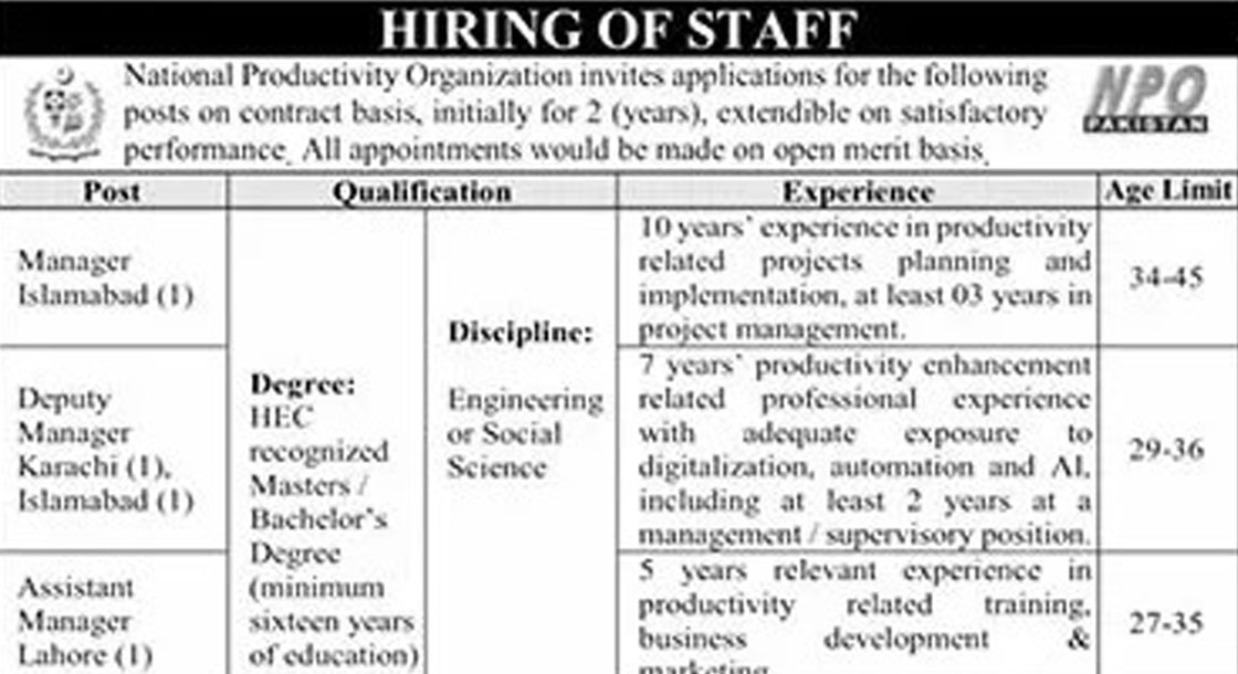 CAREER OPPORTUNITIES National Productivity Organization NPO Jobs 2026 The National Productivity Organization (NPO) has officially announced Hiring of Staff for multiple positions under a performance-based contract for an initial period of two years, extendable based on satisfactory performance. This latest recruitment drive offers excellent career opportunities for qualified, motivated, and experienced professionals who wish to work with a reputable public… Read More »