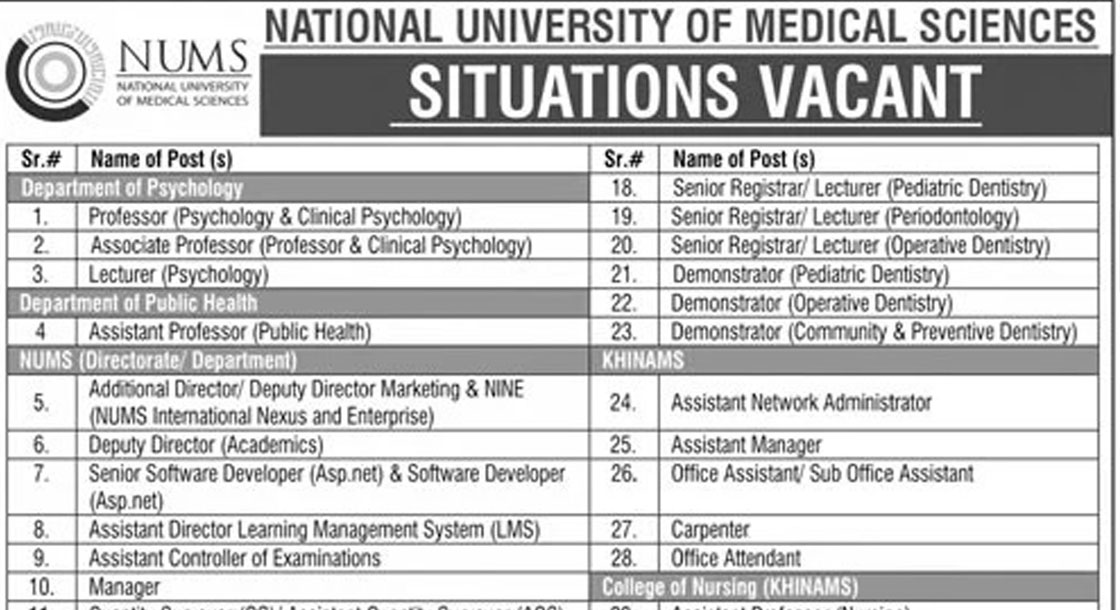 CAREER OPPORTUNITIES National University of Medical Sciences NUMS Jobs 2025 The National University of Medical Sciences (NUMS) has announced an extensive list of vacancies across its various departments, colleges, and affiliated institutions. NUMS, a leading medical university, is seeking highly qualified and dedicated professionals for faculty, technical, administrative, and management positions. This recruitment drive offers numerous opportunities… Read More »