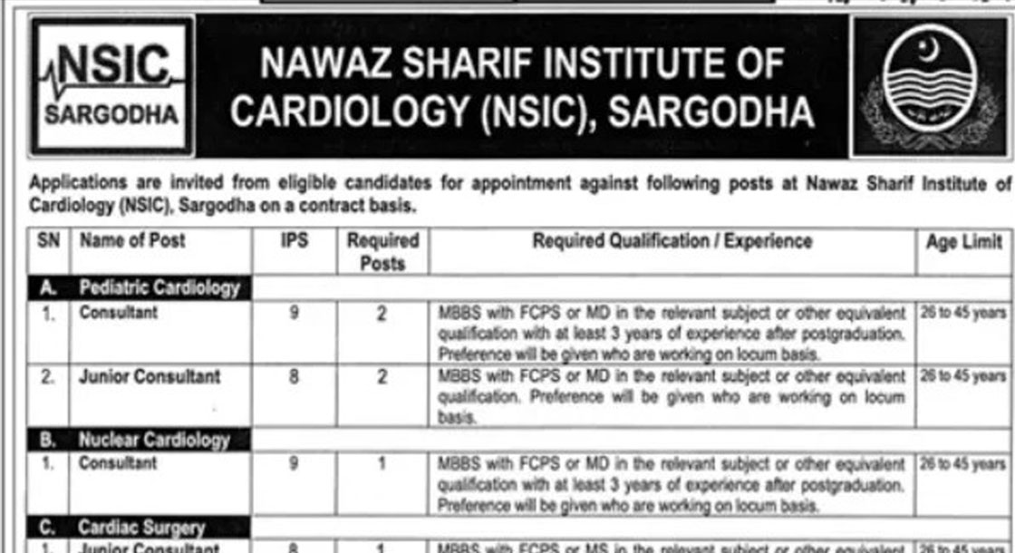 CAREER OPPORTUNITIES Nawaz Sharif Institute of Cardiology Jobs 2026 Apply Now The Nawaz Sharif Institute of Cardiology Sargodha Jobs 2026 have been officially announced for qualified medical professionals. Applications are invited from eligible candidates for appointment on a contract basis at NSIC Sargodha, one of Punjab’s leading cardiac healthcare institutions. These vacancies offer an excellent opportunity for doctors specializing in Pediatric… Read More »