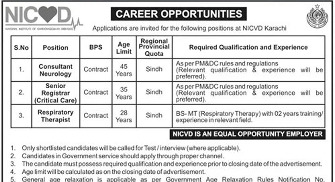 National Institute of Cardiovascular Diseases NICVD Karachi Jobs 2026