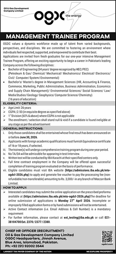CAREER OPPORTUNITIES OGDCL Management Trainee Program April 2026 Apply Online We hope you achieve your goals and land a well-paying job. We over at https://idealjobs.pk are working hard towards your better future, and we hope you will always support our platform. VACANT POSITIONS IMPORTANT INSTRUCTIONS & HOW TO APPLY