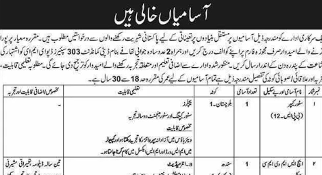 CAREER OPPORTUNITIES Pak Army New Government Jobs 2025 October A prominent public sector department has announced new permanent job vacancies for Pakistani citizens who meet the specified merit-based criteria. The organization is seeking to fill several key positions in its 303 Spares Depot EME, Lahore Cantt, inviting applications for the roles of Store Keeper, HSM Vehicle Mechanic,… Read More »