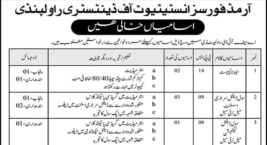 CAREER OPPORTUNITIES Armed Forces Institute of Dentistry Rawalpindi Jobs 2026   We hope you achieve your goals and land a well-paying job. We over at https://idealjobs.pk are working hard towards your better future, and we hope you will always support our platform. VACANT POSITIONS IMPORTANT INSTRUCTIONS & HOW TO APPLY