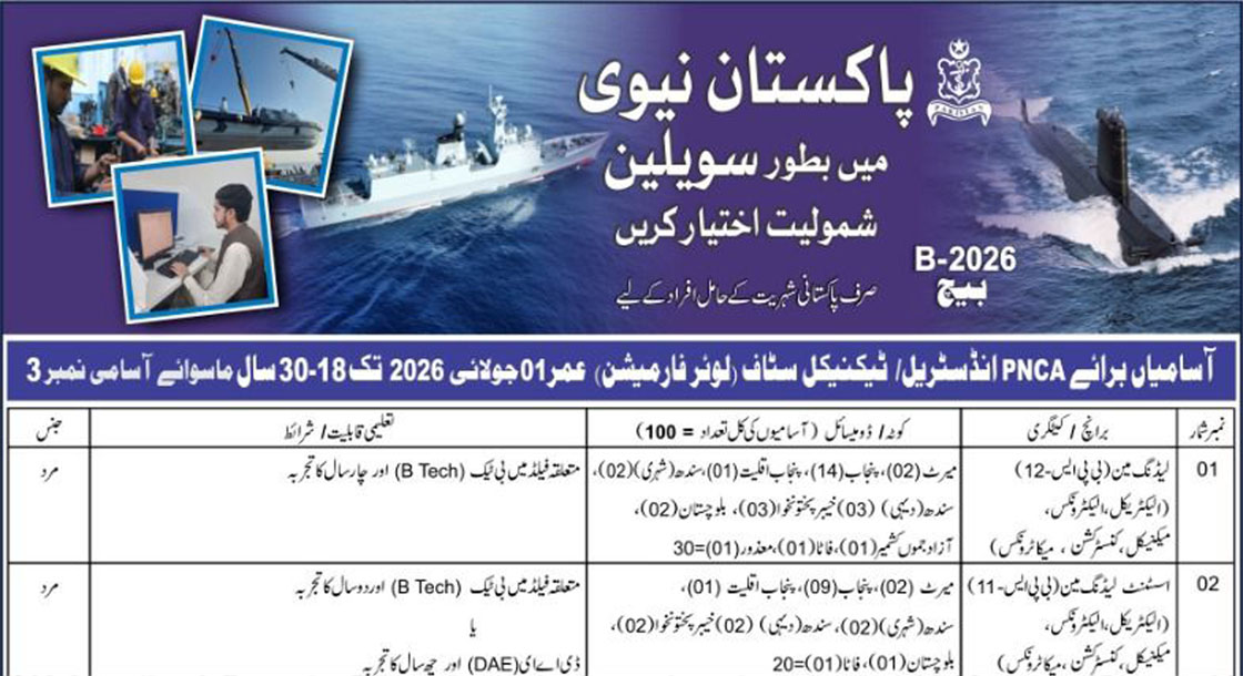 CAREER OPPORTUNITIES Pakistan Navy Civilian Jobs 2026 Apply Online This article provides a comprehensive guide for Pakistani citizens interested in joining the Pakistan Navy as a Civilian for the B-2026 Batch. If you are looking for a stable career in the defense sector with various technical and administrative roles, this recruitment drive offers opportunities for candidates with qualifications… Read More »