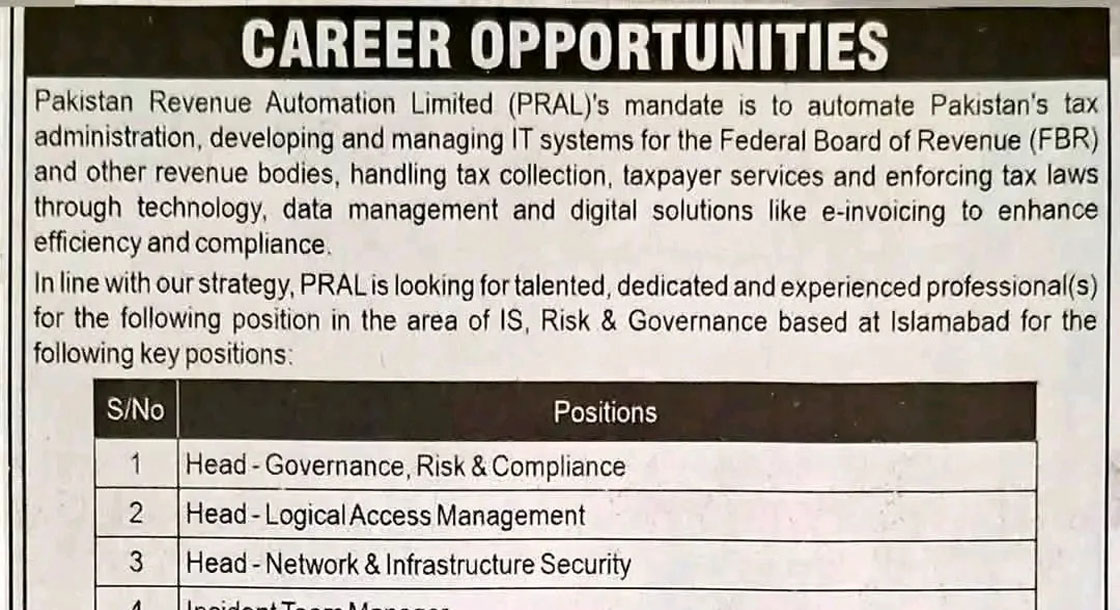 CAREER OPPORTUNITIES Pakistan Revenue Automation Limited PRAL Jobs 2026 We hope you achieve your goals and land a well-paying job. We over at https://idealjobs.pk are working hard towards your better future, and we hope you will always support our platform. VACANT POSITIONS IMPORTANT INSTRUCTIONS & HOW TO APPLY