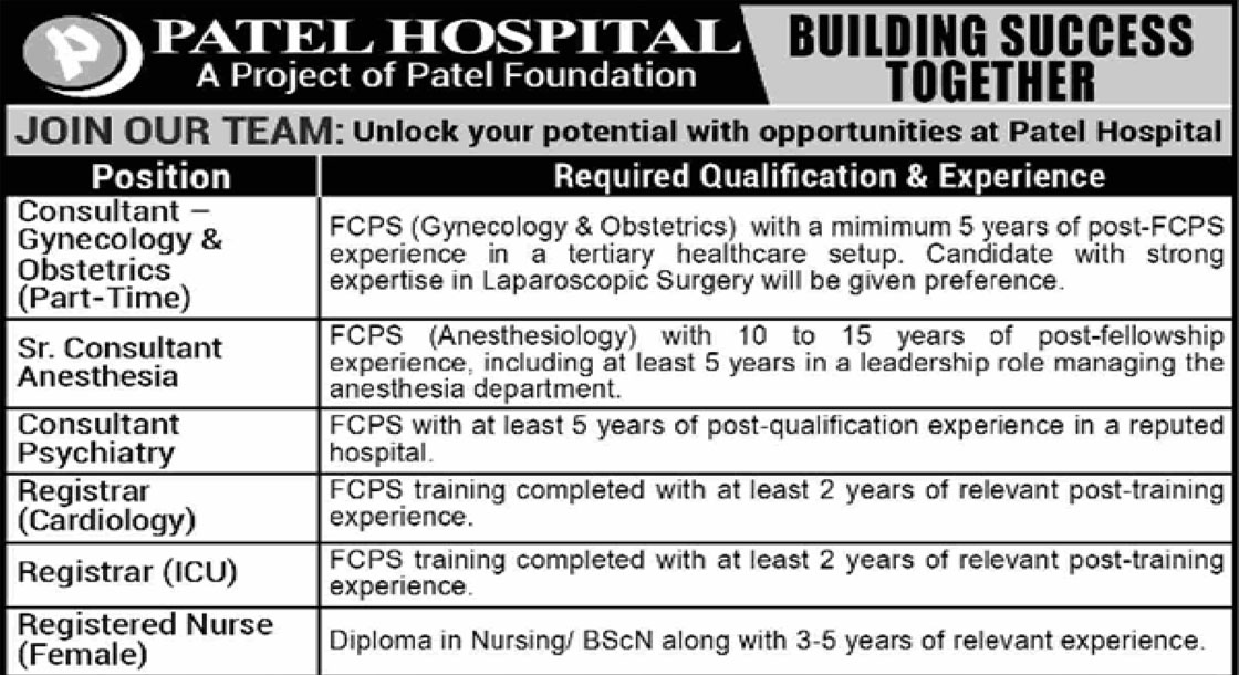 CAREER OPPORTUNITIES Patel Hospital Karachi Jobs March 2026. We hope you achieve your goals and land a well-paying job. We over at https://idealjobs.pk are working hard towards your better future, and we hope you will always support our platform. VACANT POSITIONS IMPORTANT INSTRUCTIONS & HOW TO APPLY