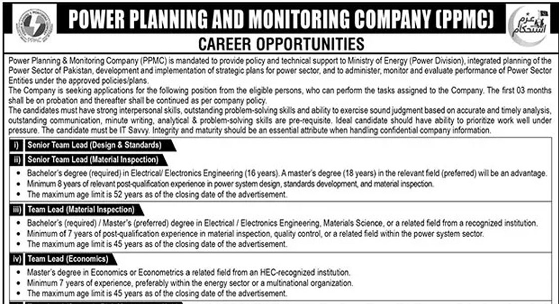 CAREER OPPORTUNITIES Power Planning and Monitoring Company PPMC Jobs 2025 The Power Planning and Monitoring Company (PPMC), an integral part of the Ministry of Energy (Power Division), has invited applications from highly qualified and experienced professionals for a wide range of senior and mid-level positions. The company is seeking to fill numerous roles critical to… Read More »