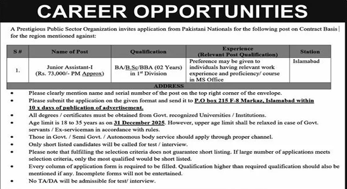 CAREER OPPORTUNITIES Progressive Public Sector Organization PSO Jobs 2026 ISLAMABAD, Pakistan – A prestigious and progressive Public Sector Organization is inviting applications from highly qualified Pakistani Nationals for exciting career opportunities on a contract basis. This is an excellent chance to join a dynamic organization in a key administrative role within Islamabad. VACANT POSITIONS IMPORTANT INSTRUCTIONS & HOW… Read More »