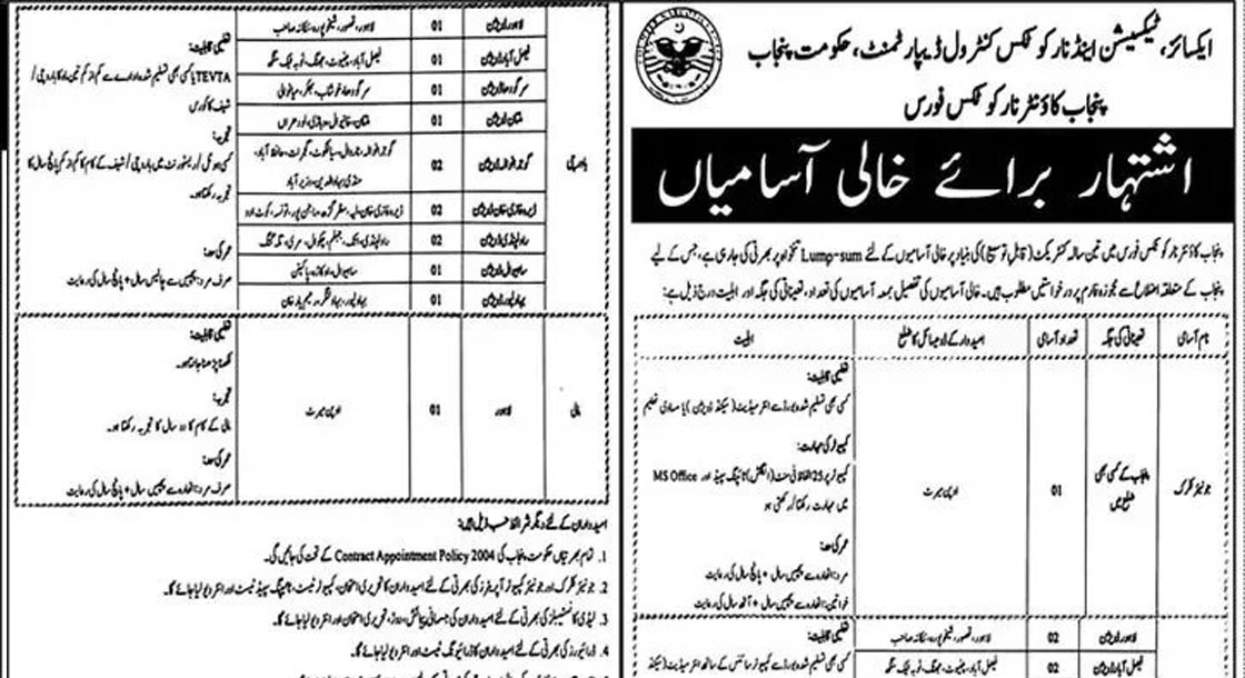 CAREER OPPORTUNITIES Punjab Excise & Taxation Department Jobs 2025 The Government of Punjab, Excise, Taxation & Narcotics Control Department, is embarking on a major recruitment initiative to strengthen its field operations by hiring over 150 personnel for the Punjab Counter Force. These vacancies are being offered on a Lump-Sum Package for a period of three years, which is extendable. VACANT POSITIONS… Read More »