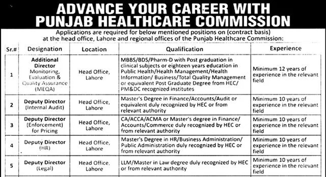 CAREER OPPORTUNITIES Punjab Healthcare Commission Jobs September 2025 We hope you achieve your goals and land a well-paying job. We over at https://idealjobs.pk are working hard towards your better future, and we hope you will always support our platform. CAREER OPPORTUNITIES IMPORTANT INSTRUCTIONS & HOW TO APPLY