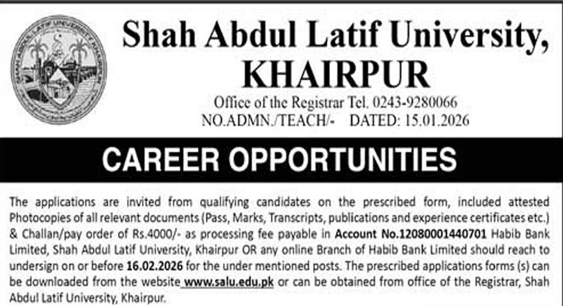 CAREER OPPORTUNITIES Shah Abdul Latif University SALU Sindh Jobs 2026 We hope you achieve your goals and land a well-paying job. We over at https://idealjobs.pk are working hard towards your better future, and we hope you will always support our platform. VACANT POSITIONS IMPORTANT INSTRUCTIONS & HOW TO APPLY