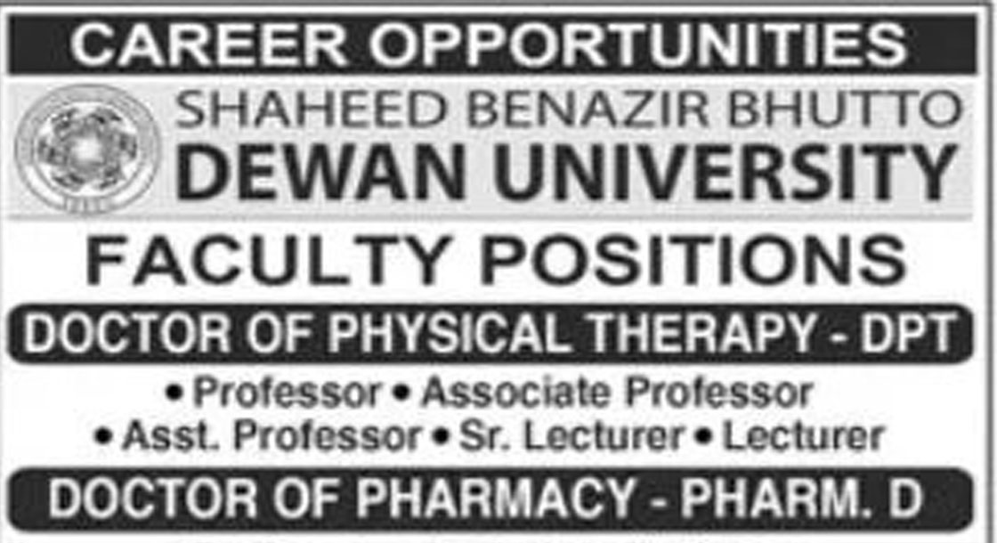 CAREER OPPORTUNITIES Shaheed Benazir Bhutto Dewan University Jobs 2026 Shaheed Benazir Bhutto Dewan University (SBBDU) Karachi has officially announced latest career opportunities 2026 for highly qualified, motivated, and experienced professionals. According to the recent advertisement, the university is inviting applications for Faculty Positions and Administrative Jobs 2026 across multiple academic disciplines. VACANT POSITIONS IMPORTANT INSTRUCTIONS & HOW TO APPLY