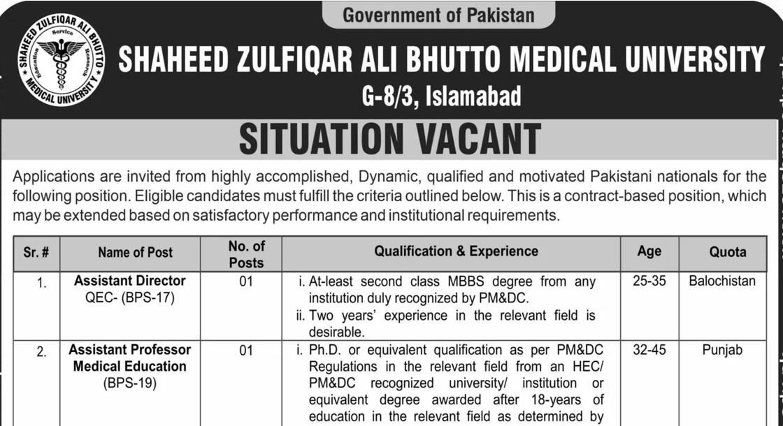 CAREER OPPORTUNITIES Shaheed Zulfiqar Ali Bhutto Medical University SZABMU Jobs 2025 Shaheed Zulfiqar Ali Bhutto Medical University (SZABMU), a premier medical institution located in Islamabad, has announced multiple career opportunities for highly qualified, dynamic, and motivated Pakistani professionals. These positions are offered on a contract basis, extendable subject to performance and institutional requirements. The recruitment aims… Read More »