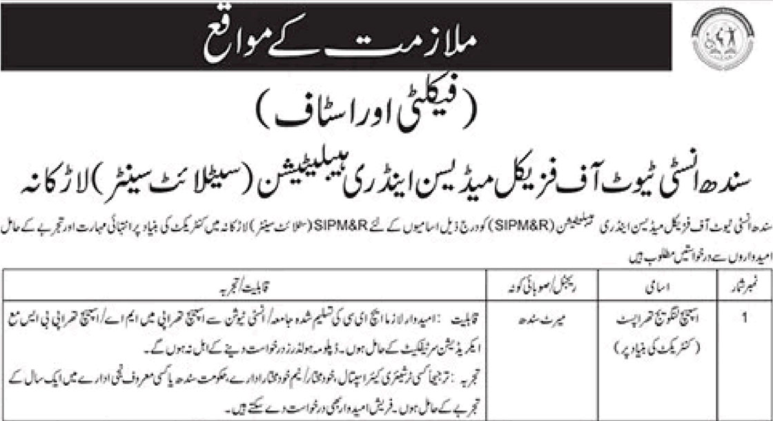 CAREER OPPORTUNITIES Sindh Institute of Physical Medicine and Rehabilitation Larkana New Jobs 2025 We hope you achieve your goals and land a well-paying job. We over at https://idealjobs.pk are working hard towards your better future, and we hope you will always support our platform. VACANT POSITIONS IMPORTANT INSTRUCTIONS & HOW TO APPLY