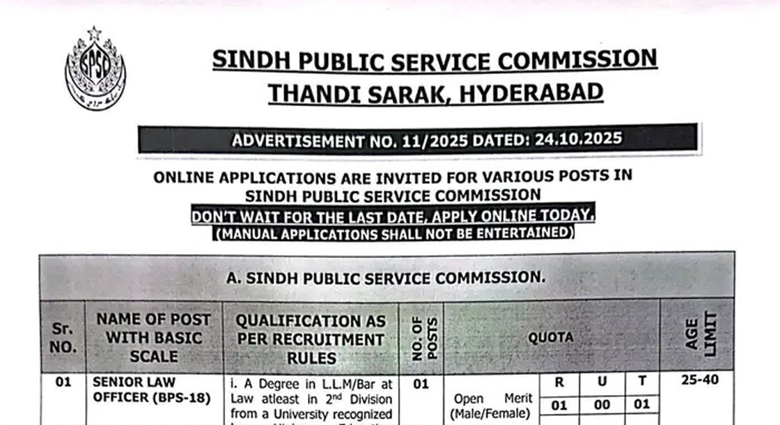 CAREER OPPORTUNITIES Sindh Public Service Commission SPSC Jobs 2025 for Senior Law Officer and Law Officer The Sindh Public Service Commission (SPSC) has invited online applications for two key legal positions within the commission itself. The vacancies are for a Senior Law Officer (BPS-18) and a Law Officer (BPS-17), as announced in Advertisement No. 11/2025.… Read More »