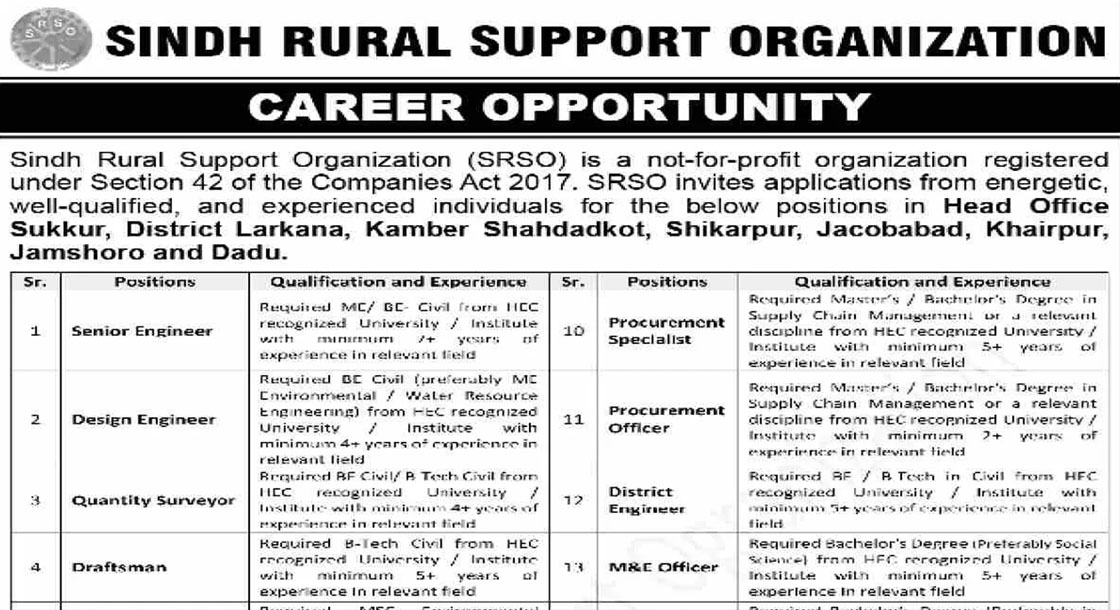 CAREER OPPORTUNITIES Sindh Rural Support Organization SRSO Sindh Latest Jobs 2025 The Sindh Rural Support Organisation (SRSO) has announced its Latest Jobs 2025, welcoming applications from qualified, energetic, and experienced professionals. SRSO, a reputable not-for-profit organisation registered under Section 42 of the Companies Act 2017, is one of the largest rural development institutions working across Sindh. With a… Read More »