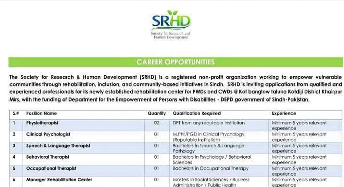 CAREER OPPORTUNITIES Society for Research & Human Development SRHD Jobs Sindh 2026   We hope you achieve your goals and land a well-paying job. We over at https://idealjobs.pk are working hard towards your better future, and we hope you will always support our platform. VACANT POSITIONS IMPORTANT INSTRUCTIONS & HOW TO APPLY