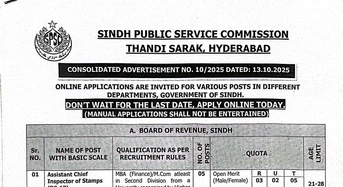 CAREER OPPORTUNITIES Sindh Public Service Commission SPSC Announces Jobs 2025 CAREER OPPORTUNITIES This recruitment drive (Consolidated Advertisement No. 10/2025) offers a significant opportunity for qualified individuals to join the provincial civil service. Interested candidates are instructed to apply online, as manual applications will not be entertained. The closing date for applications is November 7, 2025. VACANT POSITIONS… Read More »
