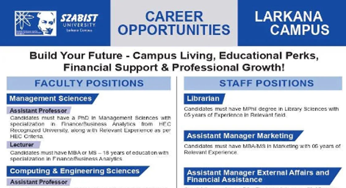 SZABIST Larkana Campus Jobs 2025 Latest Advertisement