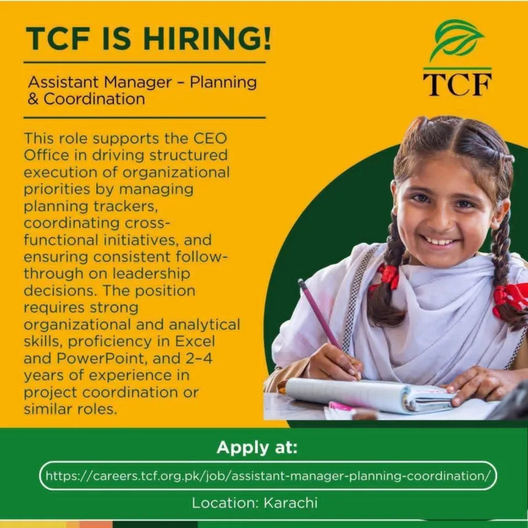 The Citizens Foundation (TCF), one of Pakistan’s leading non-profit organizations in the education sector, has officially announced a career opening for the position of Assistant Manager – Planning & Coordination. This role is based at the TCF Head Office in Karachi and offers a unique opportunity to support the CEO’s Office in driving organizational impact.