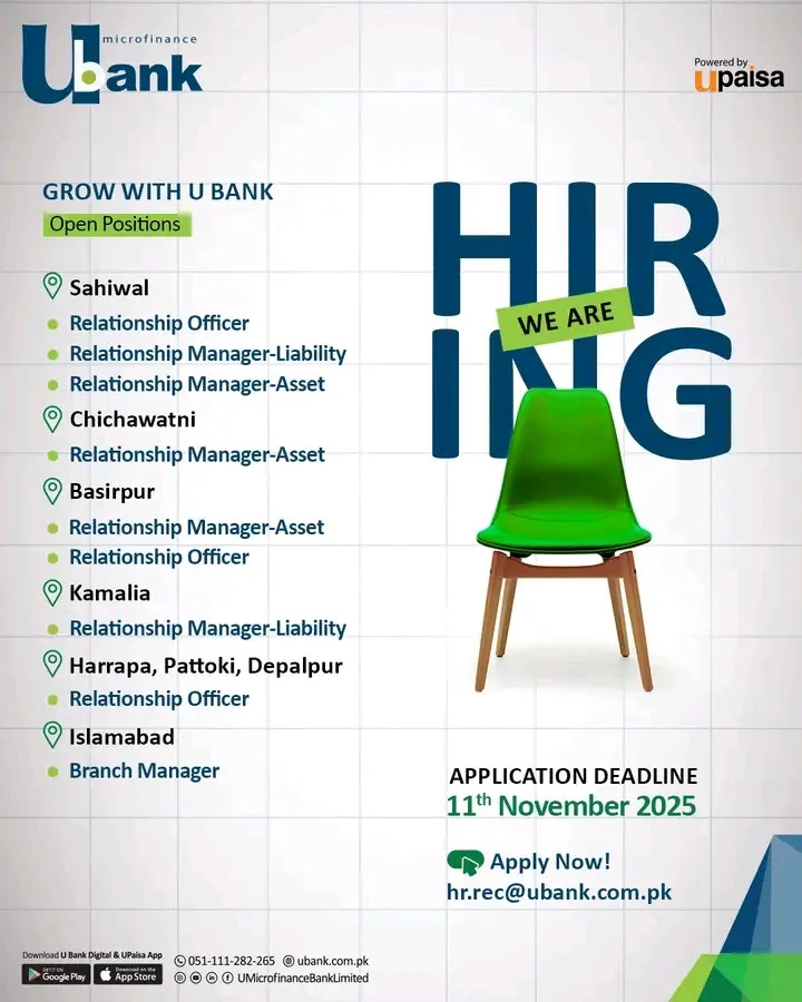 The U Microfinance Bank (U Bank), one of Pakistan’s leading microfinance institutions powered by UPaisa, has announced new and exciting career opportunities for 2025 across multiple cities in Pakistan. The announcement includes openings for both managerial and officer-level positions, providing excellent growth prospects for ambitious and talented professionals.