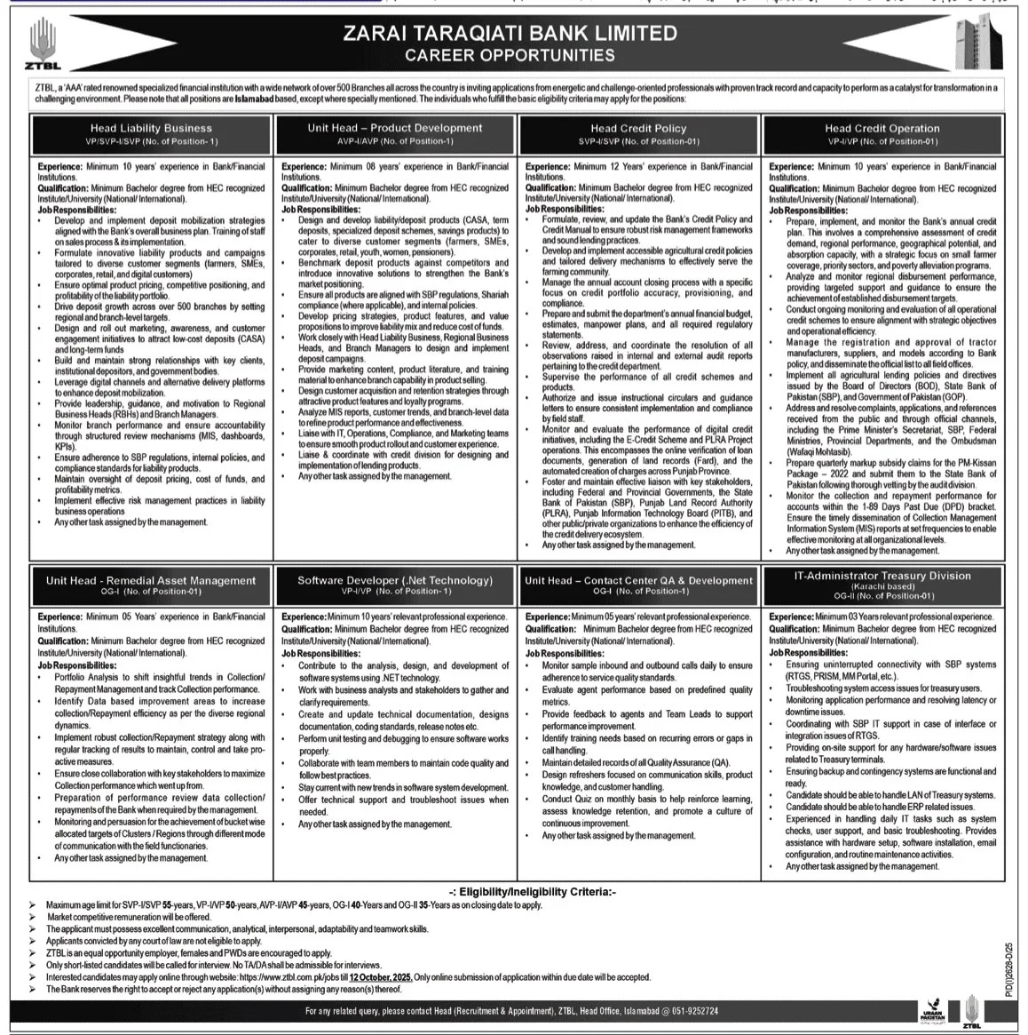 Zarai Taraqiati Bank Limited ZTBL New Jobs September 2025